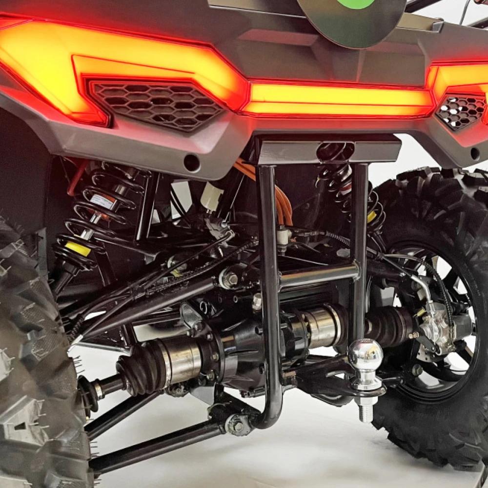 Двигатель квадроцикла – это высокоэффективный PMSM мотор мощностью 10 кВт, который обеспечивает динамичное ускорение и плавное распределение мощности. Максимальная скорость достигает 70 км/ч, что позволяет уверенно передвигаться как по проселочным дорогам, так и по легкому бездорожью, а максимальная нагрузка в 200 кг открывает широкие возможности для перевозки пассажиров и грузов. Дополнительные опции, такие как фаркоп и лебедка, значительно расширяют функциональные возможности транспортного средства, делая его незаменимым помощником в самых разнообразных ситуациях.