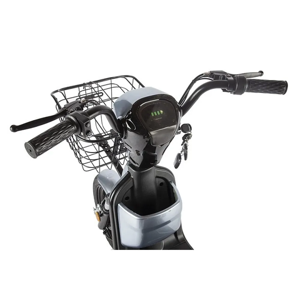 При мощности 350 Вт техника способна разогнаться до 20 км/час, что достаточно для езды по городской местности. На рулевой части электроскутера имеется необходимый для безопасного и контролируемого движения функционал. Благодаря ему райдер может оценивать скоростные характеристики и заряд АКБ (обращаем внимание, в комплектацию с техникой батарея не входит).