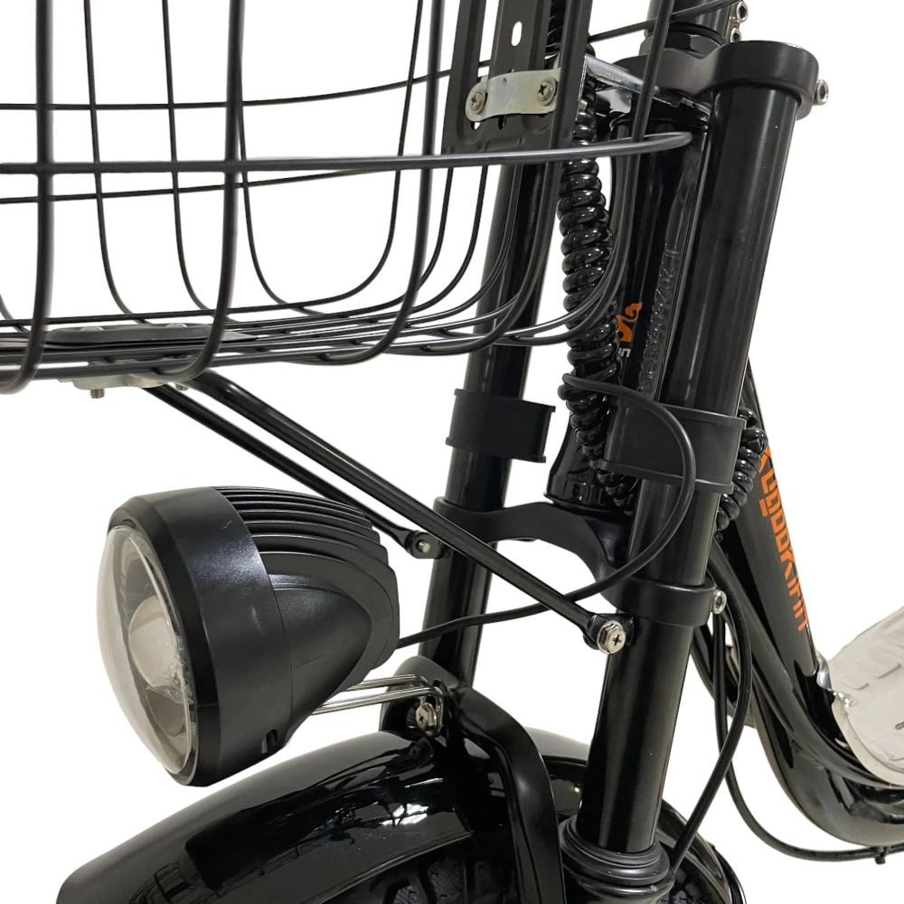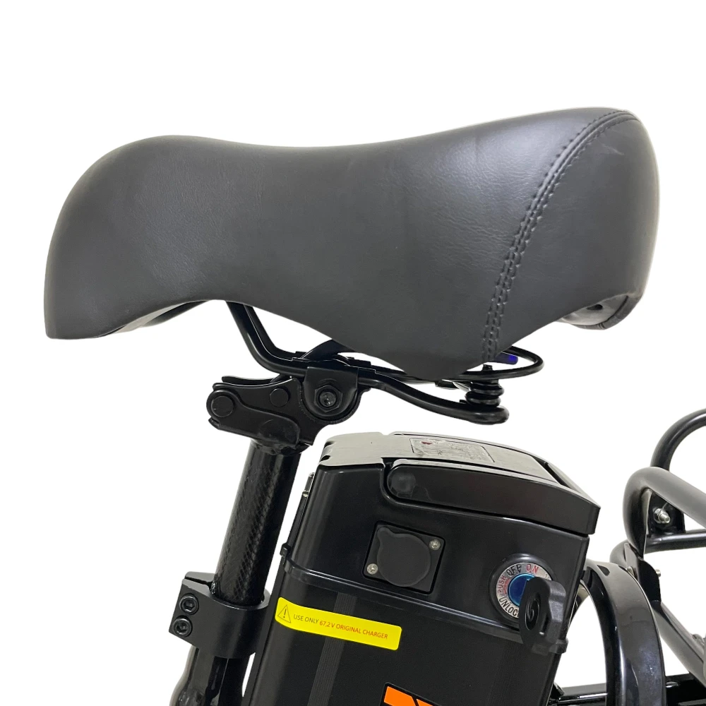 Съёмный аккумулятор 15.6 Ah обеспечивает до 60 км на одном заряде. Передняя амортизационная вилка и задний пружинный амортизатор сглаживают неровности, превращая дорогу в комфорт.
